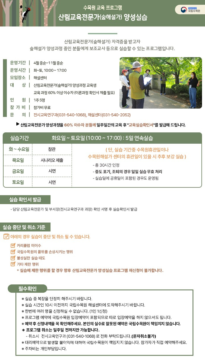 산림교육전문가(숲해설가) 자격증을 받고자 숲해설가 양성과정 중인 분들에게 보조교사 등으로 실습할 수 있는 프로그램입니다.